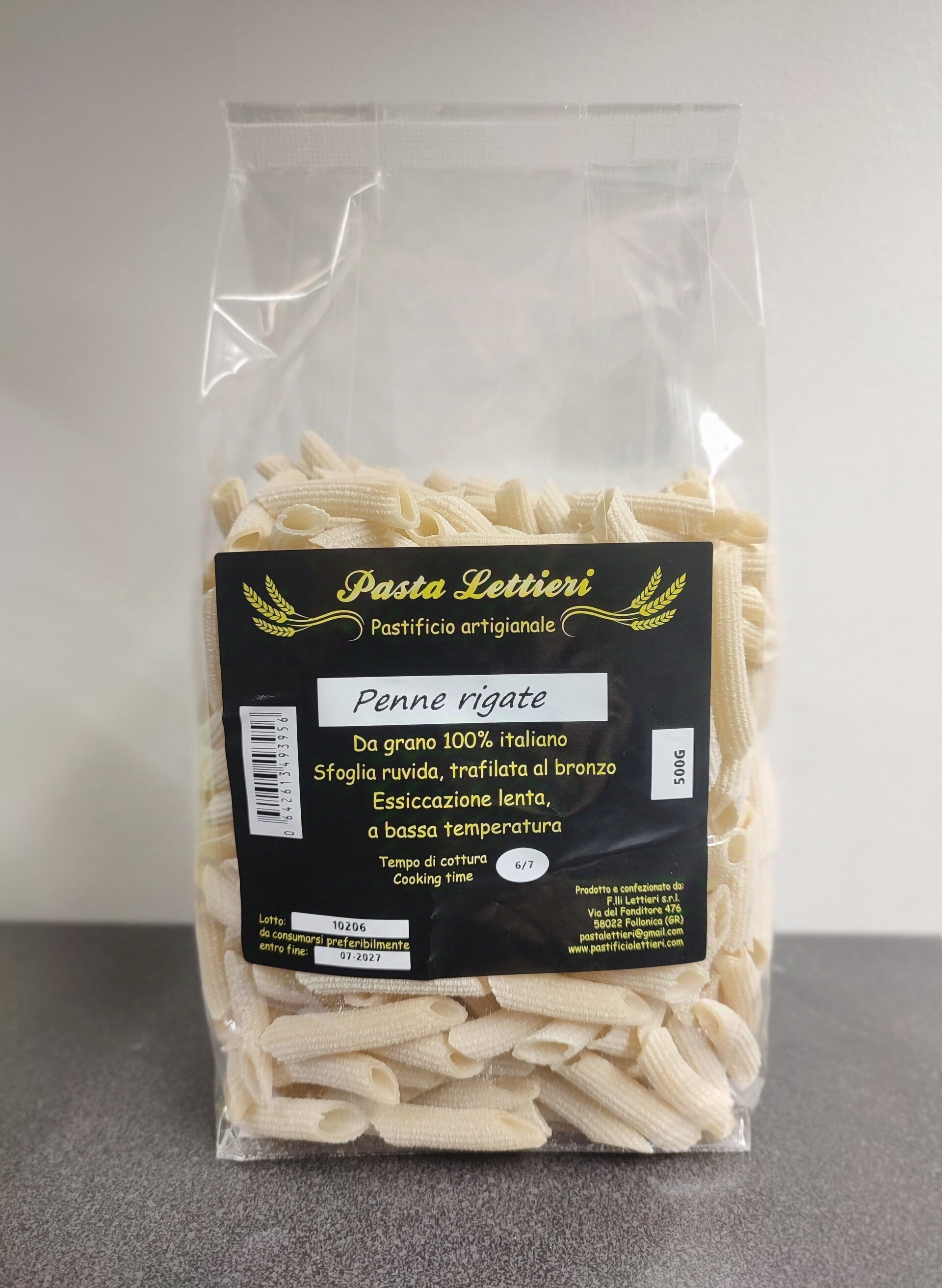 Le nostre Penne Rigate di grano duro sono caratterizzate dalle rigature profonde che trattengono perfettamente ogni condimento. La trafilatura al bronzo garantisce una texture unica e una cottura sempre al dente.